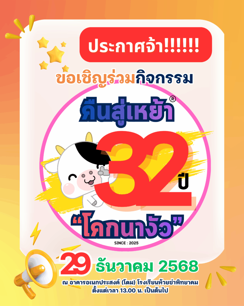 ประชาสัมพันธ์ กิจกรรมศิษย์เก่า-ศิษย์ปัจจุบัน เชิญร่วมกิจกรรม “คืนสู่เหย้า 32 ปี โคกนางัว”