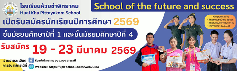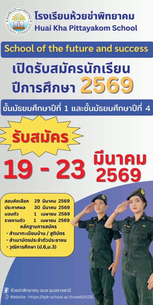 โรงเรียนห้วยข่าพิทยาคม สังกัดองค์การบริหารส่วนจังหวัดอุบลราชธานี เปิดรับสมัคร นักเรียนใหม่ ประจำปีการศึกษา 2569 ระหว่างวันที่ 19-23 มีนาคม 2569 โดยเปิดรับสมัครนักเรียน ดังนี้